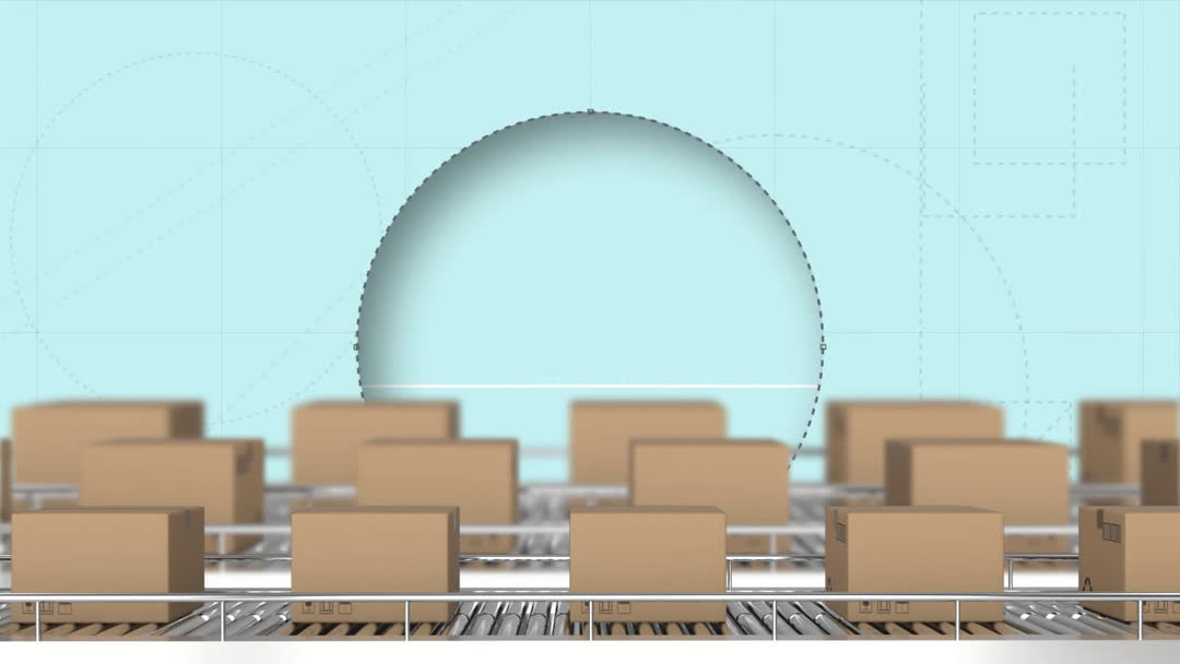 Various cardboard boxes move along industrial conveyor belts underneath a geometric circle cut animation. Illustrates the concept of automated packaging, shipping, distribution, and efficiency in modern manufacturing. Useful for topics related to logistics solutions, automation in industry, and inventory systems.
