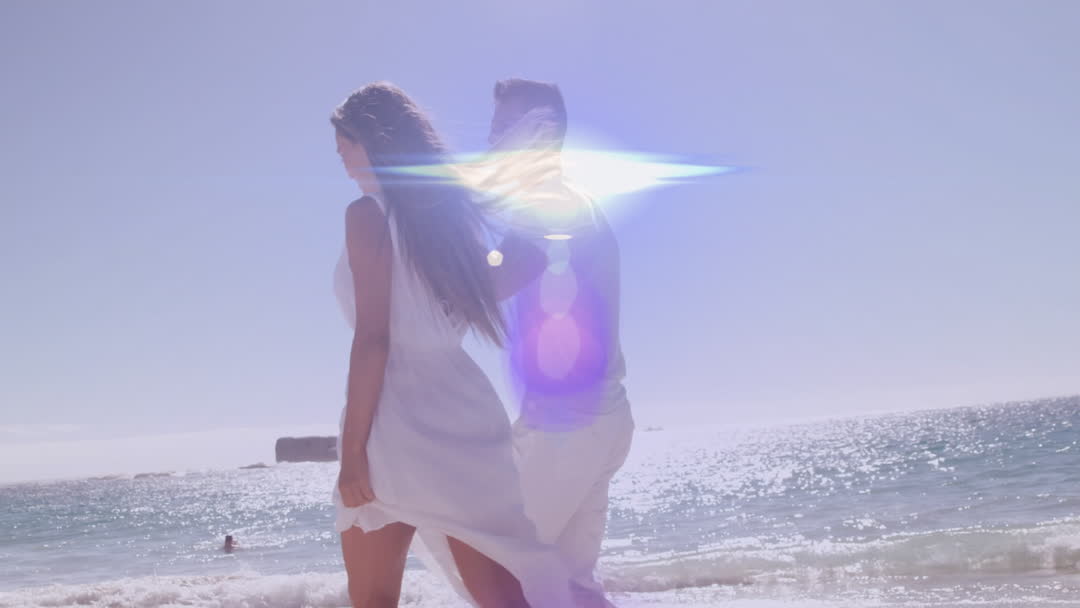 This scene features a couple enjoying a leisurely walk on a sunlit beach, with ocean waves gently flowing. Their airy, summer wear emphasizes the elements of leisure and romance, making this video suitable for travel advertisements, romantic getaway promotions, lifestyle blogs, and social media posts that evoke freedom and carefree moments by the ocean.