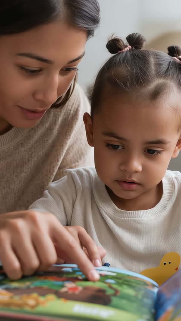AI Generated Video. Vertical video showing caregiver leaning in and pointing at picture book while preschooler follows along on sofa. Close-up framing capturing tender interaction, focused expressions, hand gestures on colorful illustrations. Natural soft light creating warm, cozy mood. Use for parenting blogs, early literacy campaigns, preschool websites, family health brochures, social media ads, online tutorials for reading aloud. Perfect for video thumbnails, hero banners, Instagram Reels, TikTok clips, educational e-learning modules. Recommend adding captions, gentle voiceover, or soft background music to enhance storytelling mood. Footage working well for campaigns about shared reading, child development, early education, bonding, caregiver support, and family engagement content.