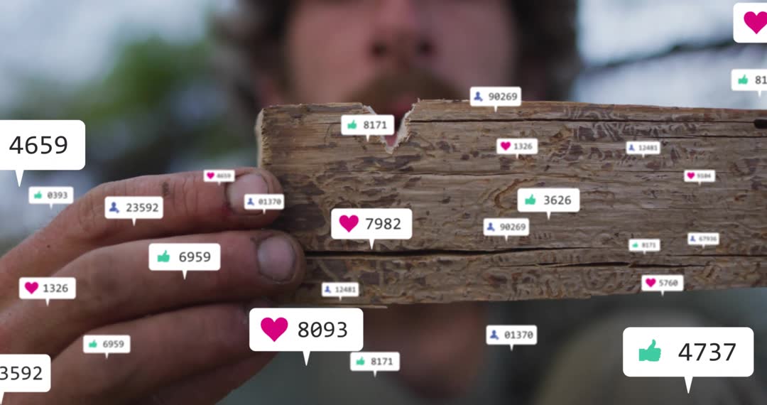 Bearded man is holding a weathered wooden plank against an outdoor backdrop. Floating social media symbols like likes and follower icons surround the wood, symbolizing modern digital interactions connected to traditional activities. Useful for content on the integration of social media in lifestyle businesses or digital engagement in unique niches.