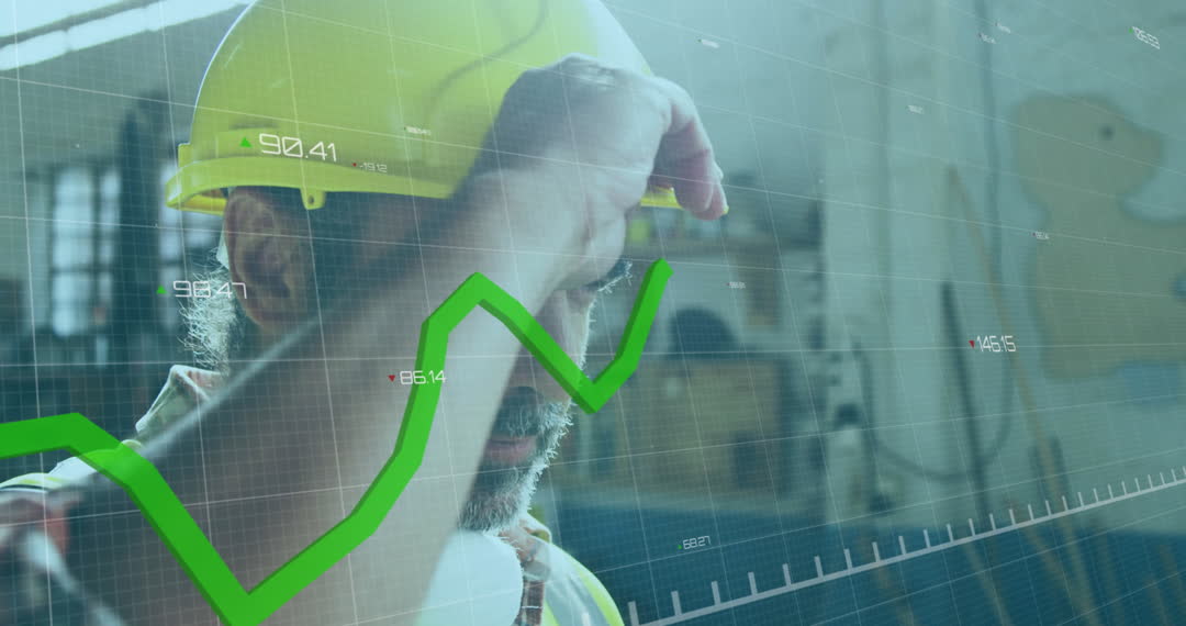 Carpenter wearing hard hat with green graph overlay symbolizes connection between craftsmanship and market dynamics. Represents analysis, planning, or response to economic conditions in construction or woodworking sectors. Suitable for articles on business resilience, craftsmen adapting to economic changes, or digital transformation in traditional industries.