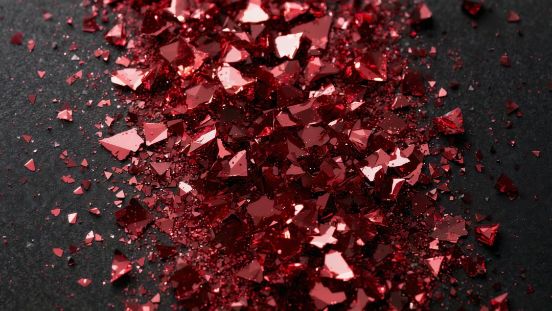 AI Generated Image. Frame showing close-up macro of red reflective shards scattering across dark textured surface, camera tightening to reveal sharp facets and dancing glints. Rich ruby tones and strong specular highlights creating moody, luxurious atmosphere while tiny glitter particles catch light and add depth. Footage working well as loopable background or overlay, offering dramatic motion for product intros, fashion promos, jewelry branding, beauty ads, website hero banners, social media reels, presentation slides, and festive campaigns. Use creative techniques such as looping slow-motion, speed ramping, overlaying text or logo, color grading to deepen reds, and adding subtle glow or particle blur to enhance cinematic feel. Capturing shallow depth of field and high resolution for flexible cropping and 4K output, also suitable for print textures, packaging mockups, and abstract visual art.