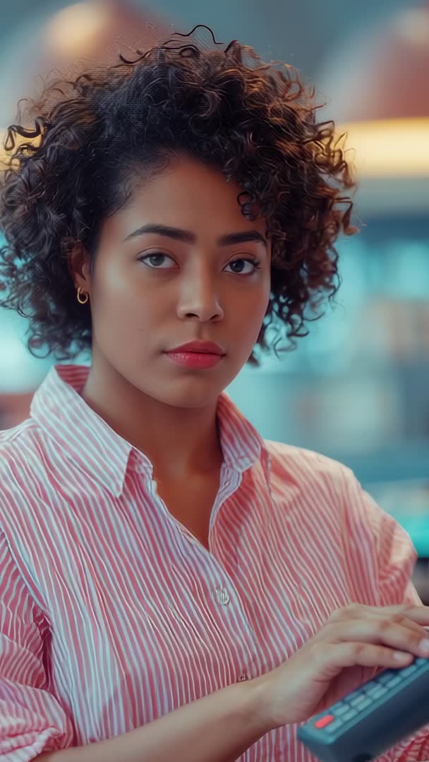 AI Generated Image. Vertical close-up video showing woman cashier in red-striped shirt pressing payment terminal at counter, capturing moment of card transaction and focused professionalism. Warm ambient background with shallow depth of field creating modern cafe atmosphere. Promoting contactless payment solutions, POS hardware, retail technology, small business marketing, cafe recruitment, customer service training, checkout process tutorials, social media ads and website hero backgrounds. Cropping for mobile stories, adding on-screen text highlighting quick secure checkout, applying upbeat music for promotional reels, recording voiceover for step-by-step payment instructions. Licensing covering commercial campaigns, fintech presentations, retail brochures, e-learning content and point-of-sale product demos.