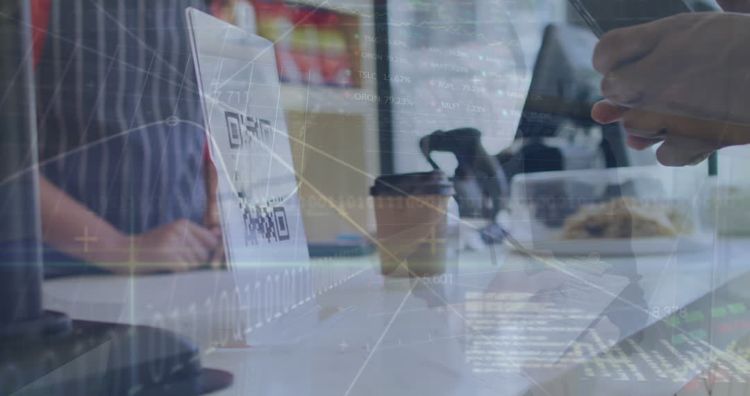 This video shows people processing a cashless transaction at a coffee shop using a smartphone, with an overlay of digital financial data and QR codes. It is suitable for illustrating modern financial transactions, digital payment services, or remote data processing for business presentations, financial blog posts, and technology articles.