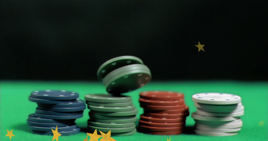 Stacks of poker chips in a variety of colors sit on a green surface, while animated stars fall over the scene, enhancing a digital or online casino atmosphere. Ideal for illustrating themes of gambling, betting, and online casino platforms. Useful for advertisements of casino games, entertainment events, or promotional materials for gaming applications.