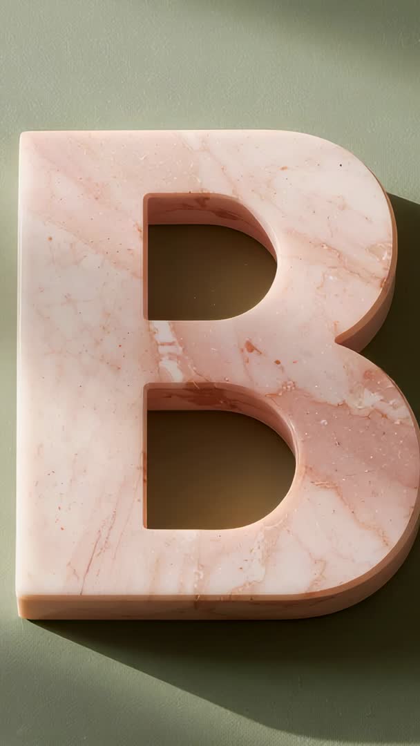 AI Generated Image. Vertical video showing polished pink marble letter B resting on green tabletop while warm studio light is casting soft shadow and highlighting natural veins. Close-up framing and low angle are emphasizing sculptural form and tactile surface, creating strong contrast between smooth stone and matte background. Color palette featuring soft blush marble and muted green is creating calm, upscale mood ideal for premium branding. Perfect for luxury branding, editorial layouts, social media reels, product promotion, logo or monogram reveal, interior design articles, packaging concepts, signage mockups, web hero banners, and store display visuals. Pair with slow reveal transitions, soft fades, subtle parallax pans, and minimal typography overlays to reinforce high-end aesthetic. Crop variations and color grading are working well for cohesive visual identity across campaign assets.