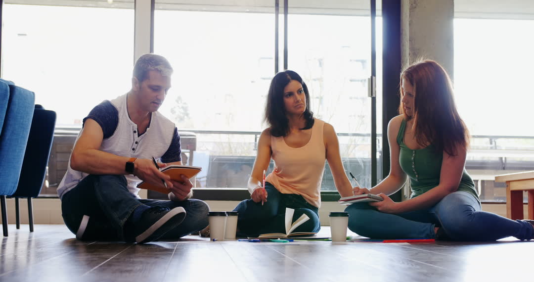 Three colleagues are sitting on the floor, engaged in a discussion. They appear to be discussing work projects, using a tablet and a notebook for reference. The setting—casual and flooded with natural light from a large window—evokes an informal and dynamic work environment, ideal for collaborative brainstorming sessions and creative meetings. This video is perfect for depicting modern office culture, team collaboration, and digital communication. It is suitable for use in business blogs, teamwork-related articles, and creative workplace promotions.