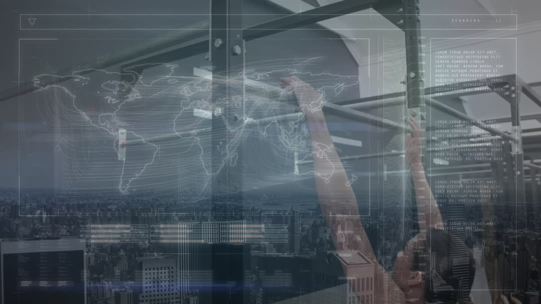 Depicts Caucasian athlete doing chin-ups intertwined with an overlay of digital data visuals against a cityscape. Ideal for illustrating concepts related to technology in fitness, urban training, global connectivity, or smart cities in marketing materials, blogs, and fitness or tech presentations.