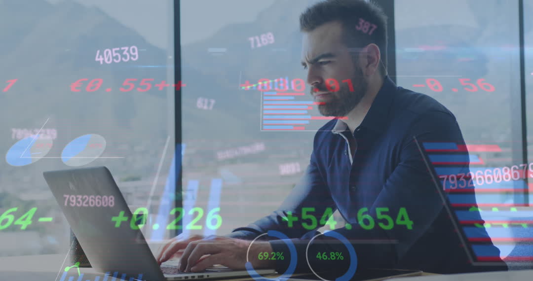 - Caucasian Businessman Analyzing Data on Laptop with Overlay of Financial Charts