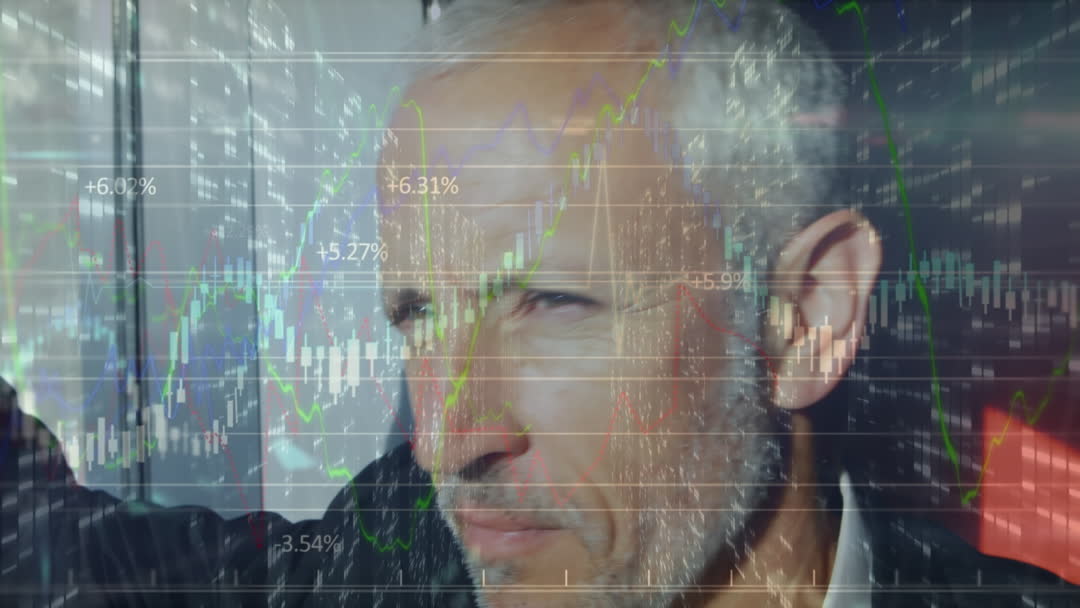 Visual blends dynamic graphs and data with focused expression of businessman contemplating economic trends. Perfect for illustrating concepts in finance, business strategy, or technology-driven market updates.