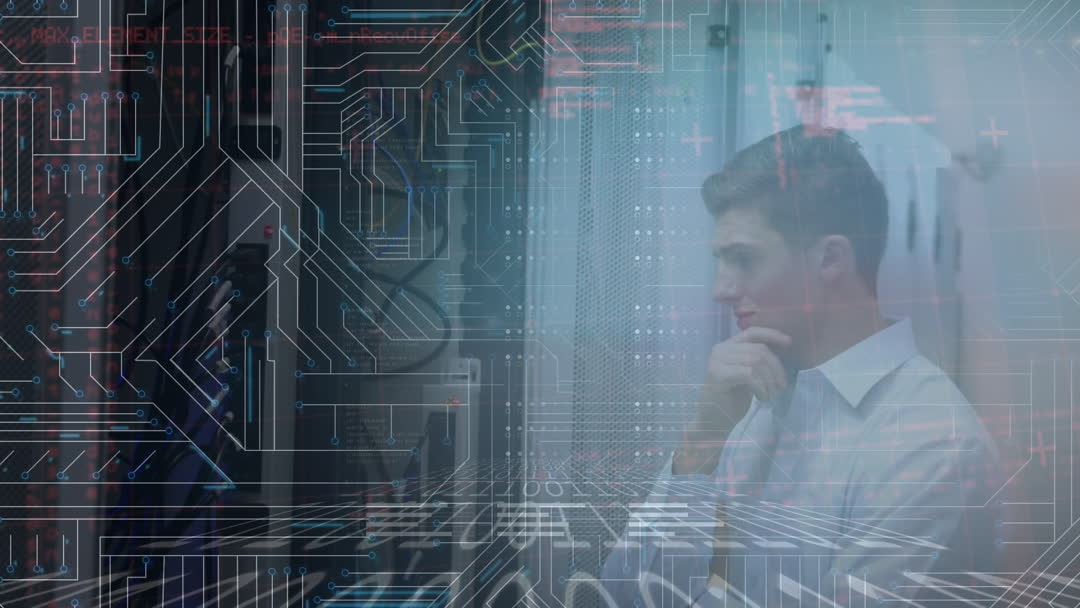 - Caucasian Businessman Analyzing Server Room with Digital Circuit Overlay