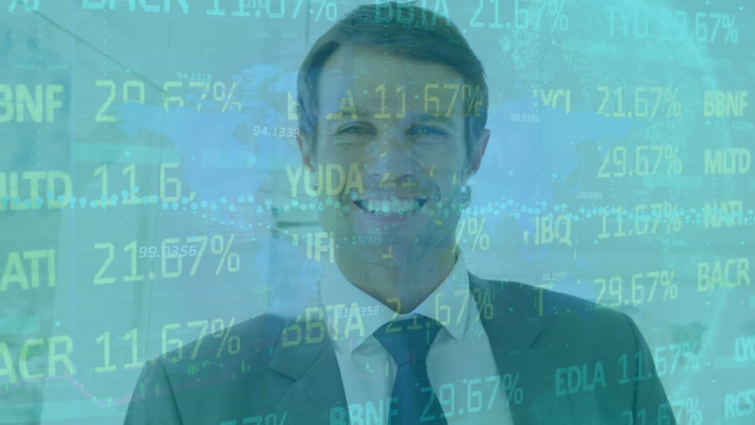 Depicts a smiling businessman with an overlay of stock market data, highlighting dynamics of business forecasting and market analysis. Useful for content related to financial growth, global economy, personal finance tips, investment advice, stock market tutorials or virtual business presentations.