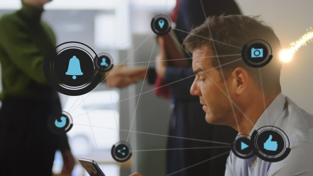 Caucasian businessman engrossed on smartphone with futuristic network connections icons floating around. Depicts innovative communication and digital interactions within a business environment. Useful for illustrating concepts of modern business communication, digital strategy, technology applications in professional settings, and social media networking.