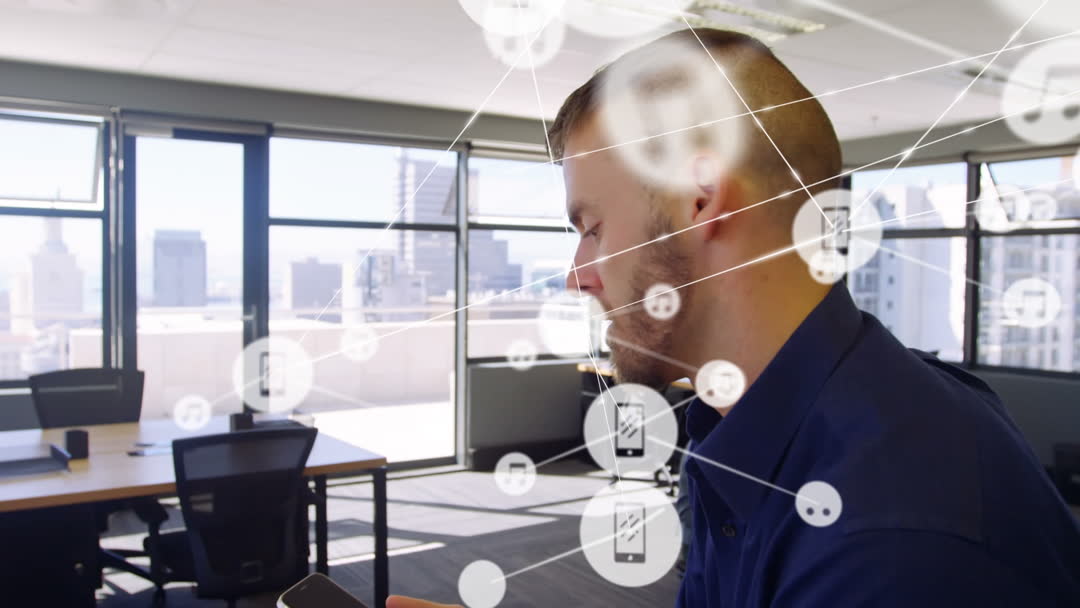 Businessman using virtual reality headset in modern office filled with network of digital connections. Icons representing communication and digital devices float around him, emphasizing connectivity and the future of work environments. Ideal for illustrating themes of technology integration, innovation in business, and cutting-edge communication strategies.