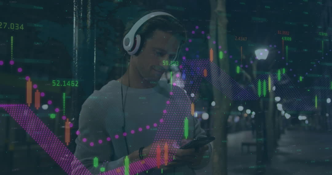Depicting a seamless combination of technology and business, this scene showcases a young businessman intently using his smartphone with vibrant financial graphs as a translucent overlay. Perfect for representing concepts of mobile finance, acquiring market insights, and technological advancement in global business. Suitable for articles and websites focused on financial technology, investment strategies, or business innovation.