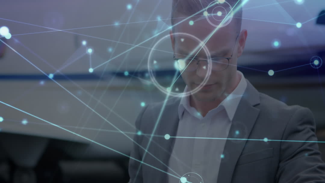 - Caucasian Businessman with Digital Network Overlay at Airport