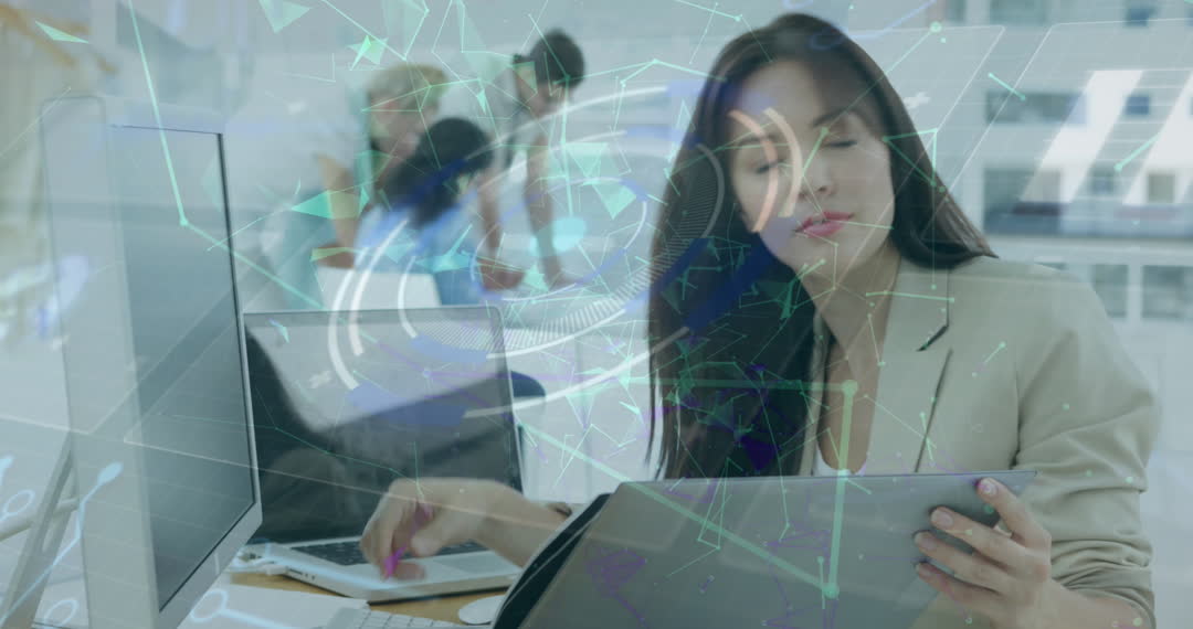 Businesswoman examines reports on tablet with digital networks overlay, representing technology integration in modern workplaces. Useful for illustrating contemporary business methods, technological advancements, or working professionals embracing innovative processes.
