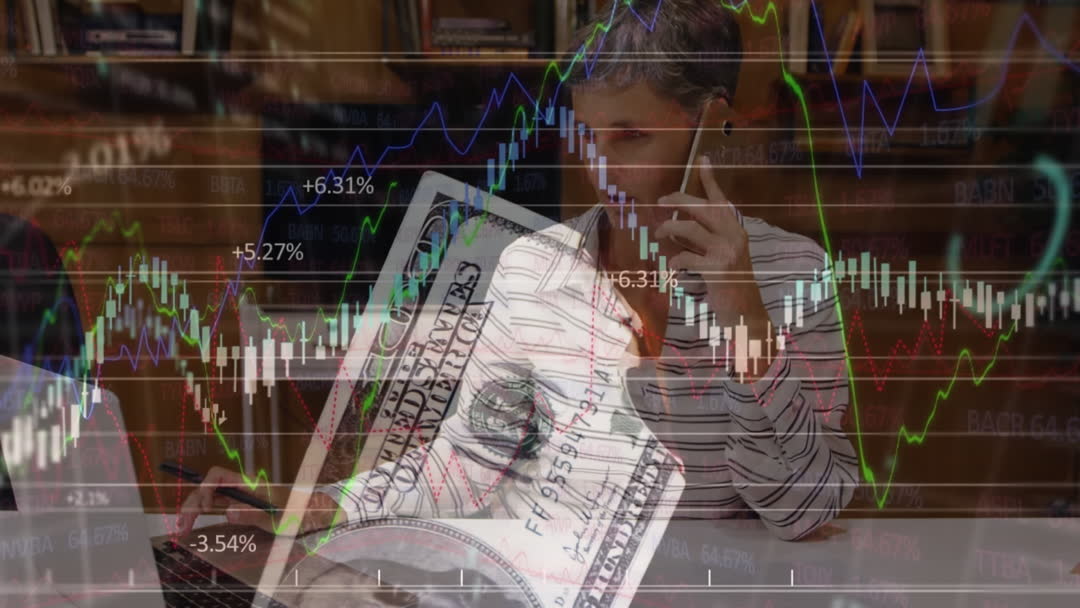 The visual shows a businesswoman using a smartphone as stock market data and currency graphics overlay her video. This can be used for content on financial analysis, global business strategies, stock trading themes, and digital finance technology. It illustrates dynamic decision-making in economic environments.