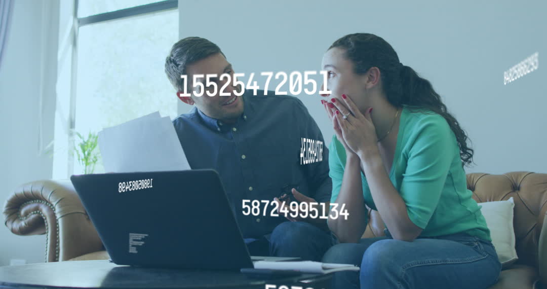Caucasian couple is sitting on a couch, focusing on a laptop screen illuminated by streaming digital numbers. Ideal for content about financial planning, digital budgeting apps, financial stress management, or technology in everyday life.