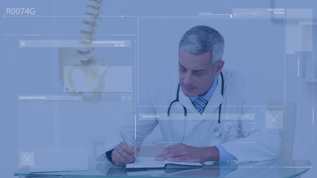 Caucasian male doctor writing in diary with overlaid digital medical interface, symbolizing innovation in healthcare technology. Suitable for use in medical blogs, tech-savvy healthcare reports, and advertisements showcasing advanced hospital or health services.