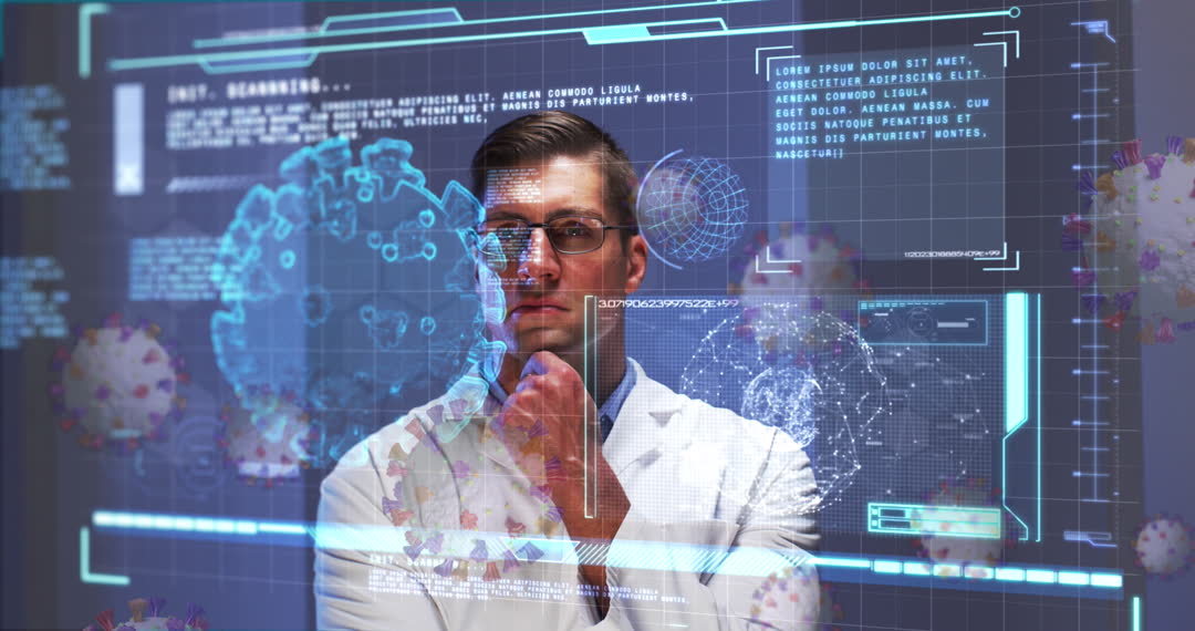 - Caucasian Doctor Analyzing Virus Cells on Digital Screen Interface