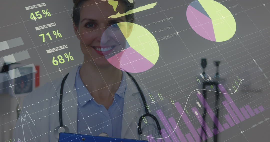 Visual depicts a female Caucasian doctor smiling while interacting with overlaid financial charts and graphs, representing integration of finance and healthcare. Useful for themes involving modern medical innovation, healthcare analytics, medical business development, and technological advancements in health industry. Suitable for articles on healthcare finance, medical data analysis, hospital management software, and the digital transformation in healthcare.