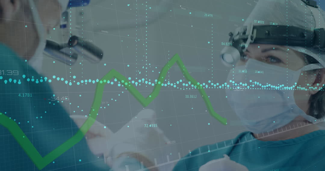 Image shows a Caucasian female doctor engaged in examining digital medical data within a surgical environment. Overlay of data charts and statistics reflects the integration of technology in modern healthcare. Useful for illustrating themes related to medical innovation, data-driven decision-making in healthcare, and the future of medical practices.