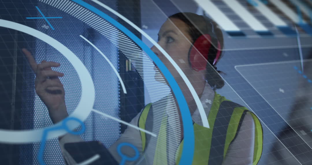 Caucasian female engineer in safety vest analyzing data interface with digital graphics overlay. Suitable for illustrating technological environments, IT careers, innovation in engineering fields, or server management presentations.