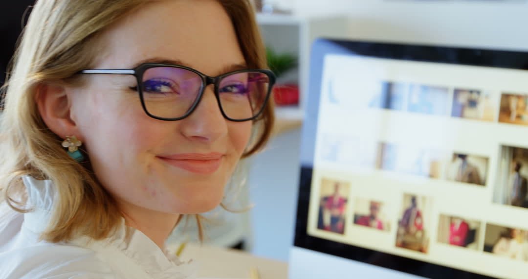 This captures a Caucasian female graphic designer at her desk in an office. She is smiling and wearing glasses, suggesting a professional yet approachable demeanor. Computer screen in the background illustrates a digital workplace. Useful for promoting graphic design services, showcasing modern work environments, or illustrating female empowerment in the creative industry.
