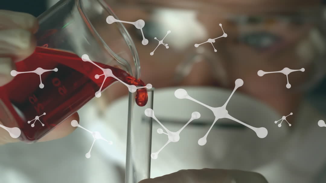 Caucasian female scientist focusing on experiment with red liquid. Molecular animation overlays video, highlighting scientific investigation. Ideal for illustrating articles on scientific research, labs, and technology-driven studies.