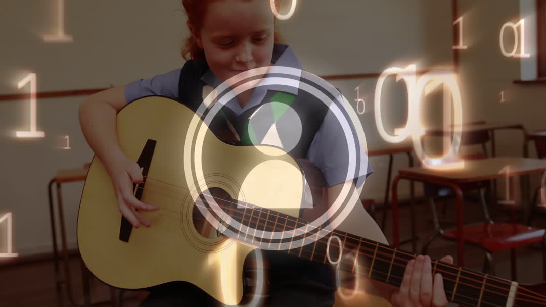 A young caucasian girl is playing guitar in a classroom setting, overlaid with binary code and technology icons, suggesting the integration of digital interfaces in music learning. This video can be used for educational content focusing on blending traditional and modern teaching methods, promotion of digital learning tools in music education, and articles regarding the evolution of classroom environments with technology.