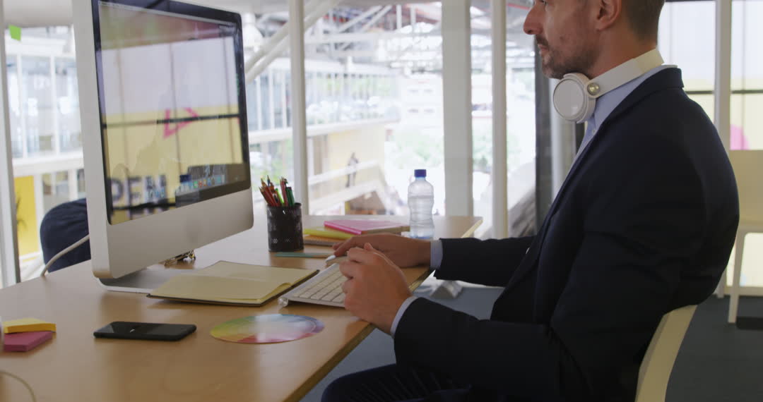A Caucasian male creative is working at his desk using a computer in a contemporary office environment. He wears headphones and is seated at a large desk with notebooks, pens, and a water bottle nearby. This scene can be used to depict modern workplace settings, productivity, technology in business environments, and professional office atmosphere.