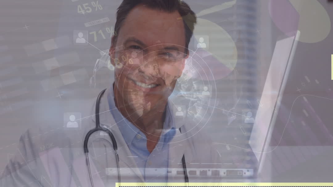 Caucasian Male Doctor Amidst Digital Analytics Overlay Video