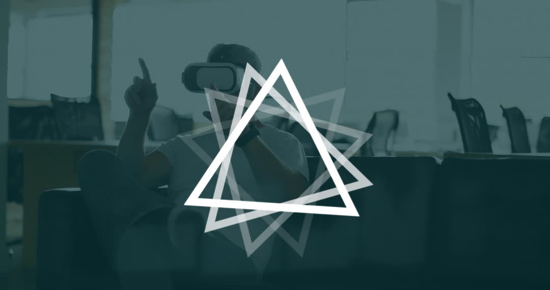 A caucasian man is using a VR headset in an office environment, illustrating the integration of modern technology in the workplace. Rotating geometric triangles in the animation suggest innovation and dynamic digital interaction. Ideal for use in topics surrounding workplace innovation, technological advancements in business, or visualizing future-oriented working environments.