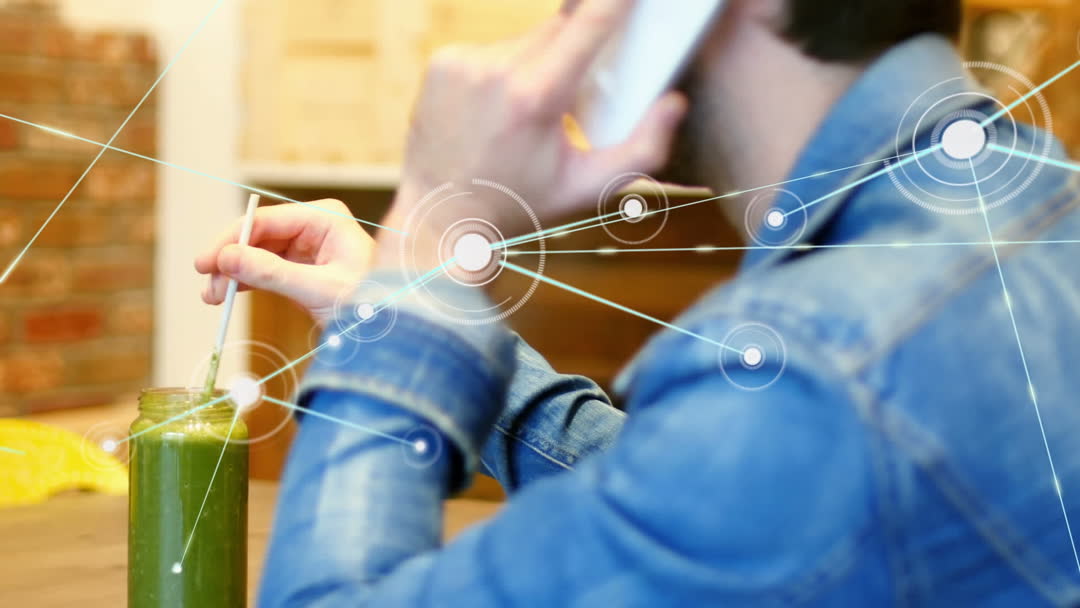 This scene portrays a modern individual multitasking with technology, ideal for illustrating communication in digital environments. Connections suggest networking, data exchange, or telecommunication themes for advertisements or articles on technology integration or enhacing user connectivity in daily scenes.