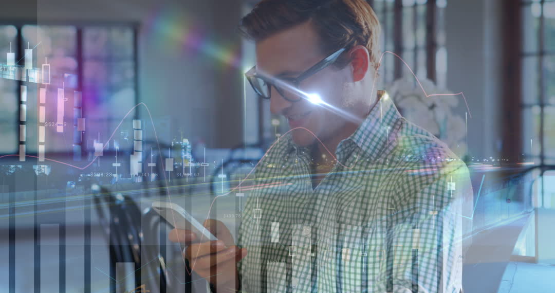 Digital overlay of graphs and financial data alongside a man using a smartphone indicates connectivity between personal technology and modern finance. Ideal for use in content related to financial apps, technology in business, investment analysis, or economic growth presentations.