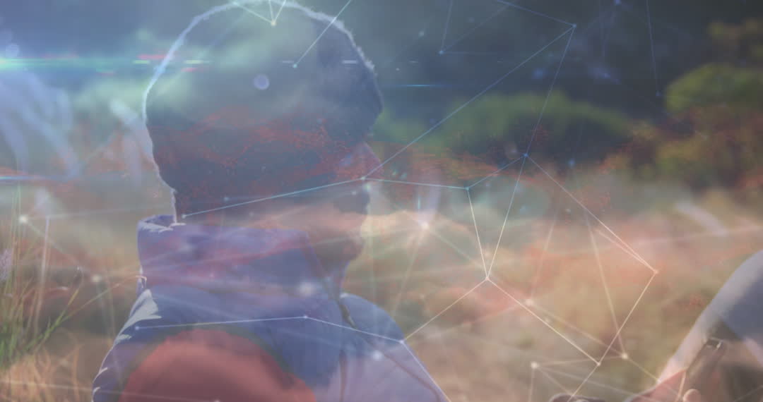 A person wearing a beanie and vest interacting with a tablet while digital network connections over lay. Suggested uses for this concept photo include illustrating digital connectivity and innovative technology themes.