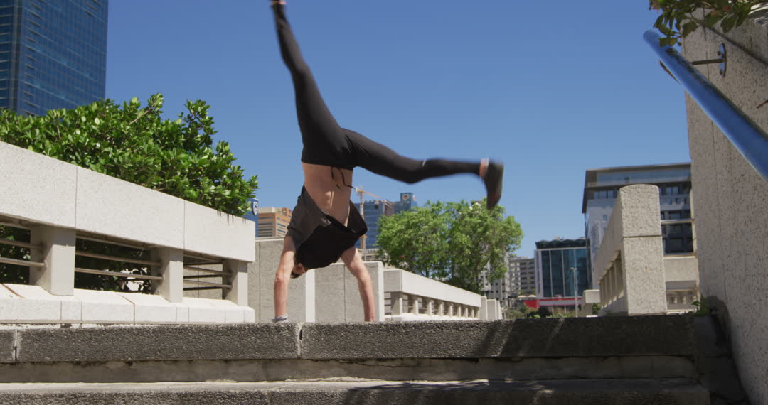 Caucasian man practicing handstand as part of a parkour routine among various tall buildings with a clear cloudy blue sky. Ideal for use in urban extreme sports content, athletic training programs, or motivational city lifestyle promotions. The scene is captured represents agility in modern environment accentuating cohesive elements flowing actions vibrant encourages encouragement go engagement feats transcend illustrating concerned drawn setting surprisingly modest others overlooking expose logical captions restful showcase overlooking.