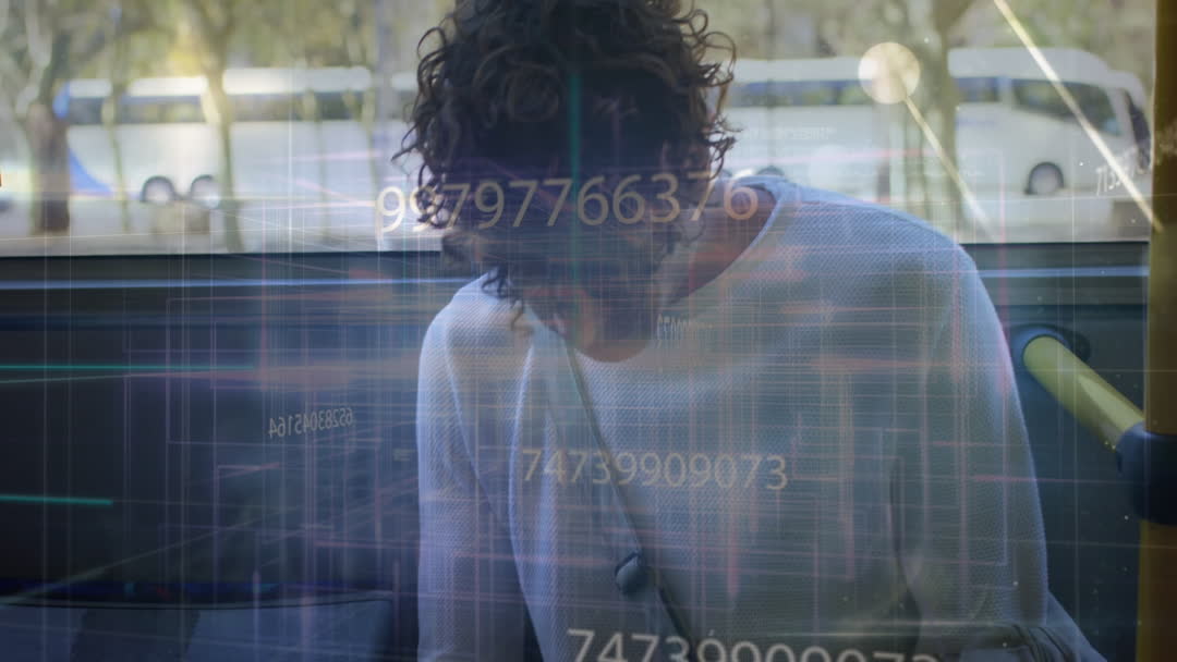 Caucasian Man Using Smartphone on Bus with Overlaid Digital Data Video