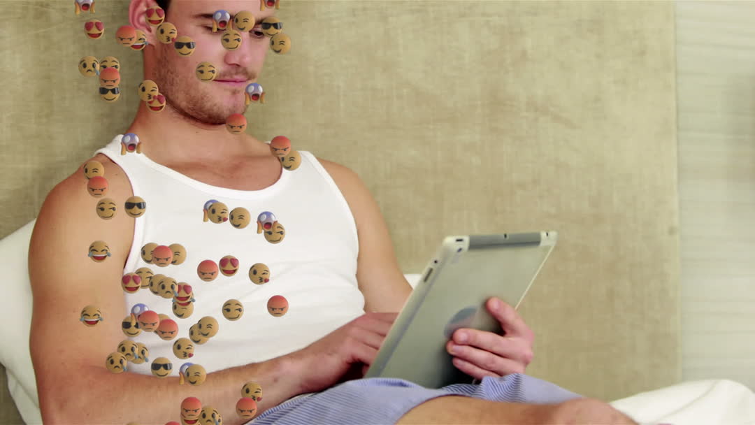 Caucasian man sitting casually on bed, engaging with a digital tablet as animated face emojis float around. Scene suggests online interaction, social media use, or digital communication in a relaxed, home environment. Ideal for visuals discussing technology's integration into daily life, modern social networks, or digital engagement trends.
