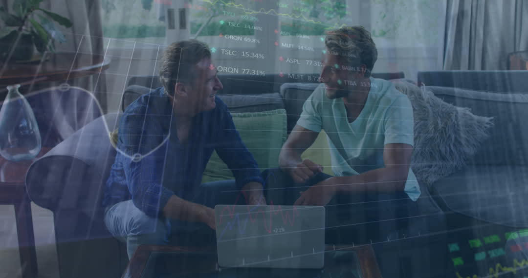 Two caucasian men are sitting on a sofa, engaging in a discussion while reviewing stock market data on a laptop. Digital charts and financial analytics overlay the scene, emphasizing technology's role in modern economic decision-making. Suitable for illustrating themes of personal finance management, home-based business discussions, investment planning, and the integration of technology in everyday life.