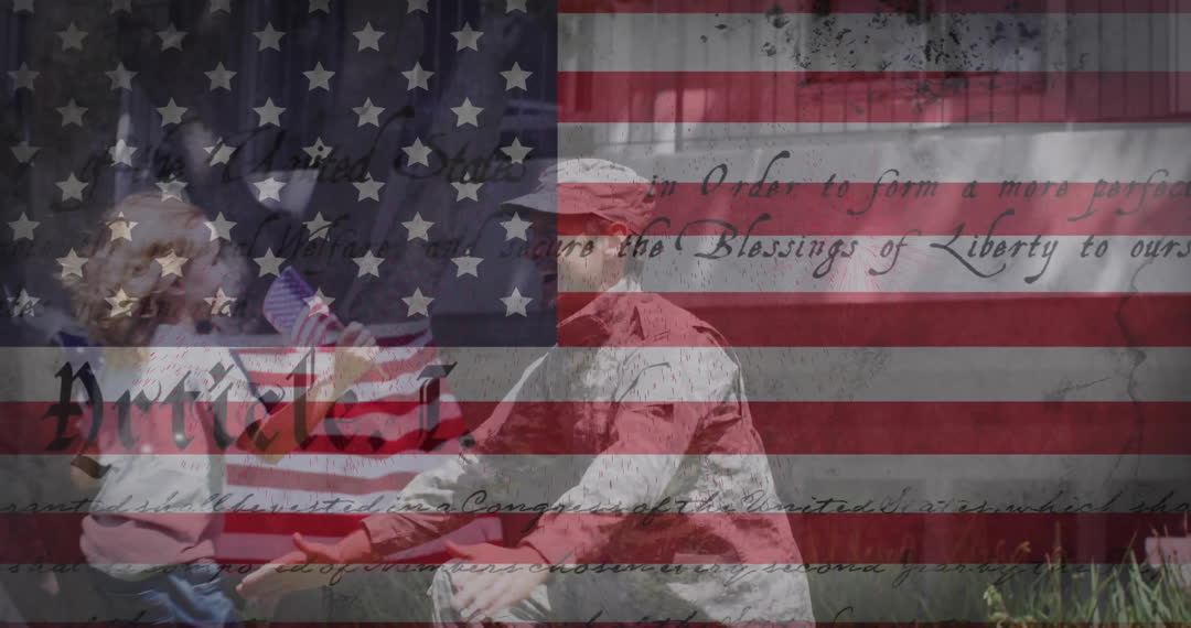 Caucasian Soldier Embracing Daughter with USA Flag and Constitution Video