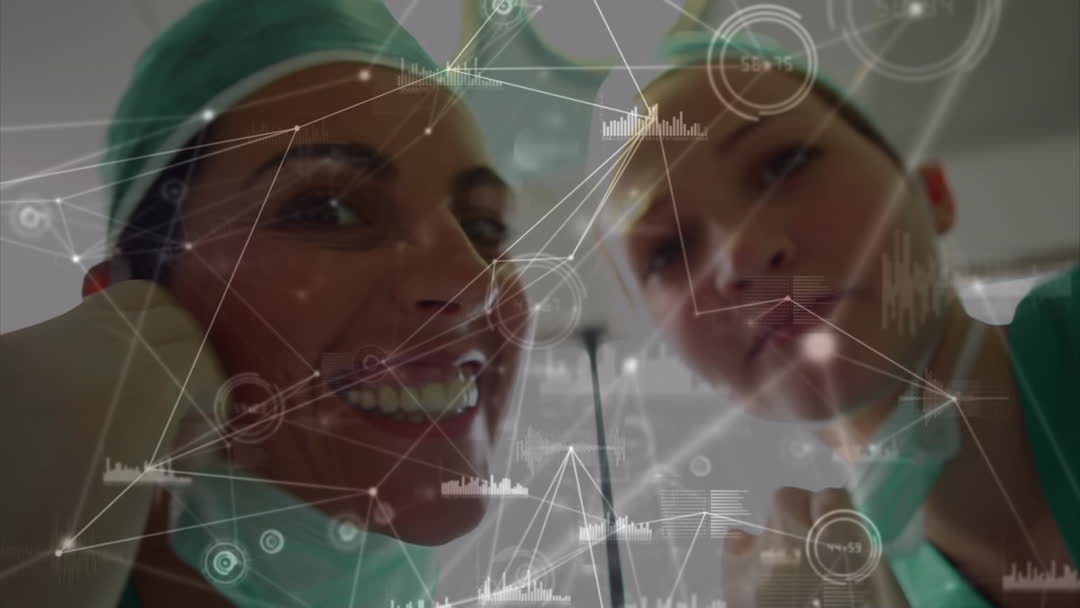This video depicts two happy Caucasian female surgeons interacting with digital health technology symbols and data visualizations. Perfect for illustrating futuristic concepts in the medical field, the impact of technology on healthcare, or advancements in surgical practices. Suitable for use by medical organizations, tech companies, or educational platforms focusing on healthcare innovations.