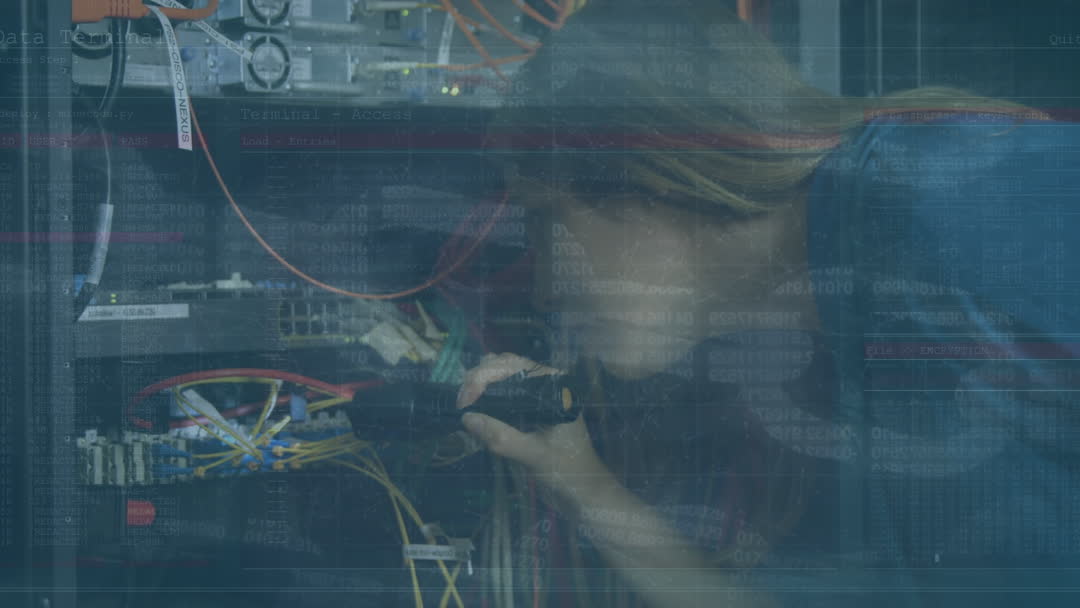 Image shows a woman technician focusing intently on networking wires in a server room, with digital data patterns overlaid, conveying an atmosphere of internet security and digital craftsmanship. Useful for illustrating modern IT professions, cybersecurity scenarios, and advancements in data management.