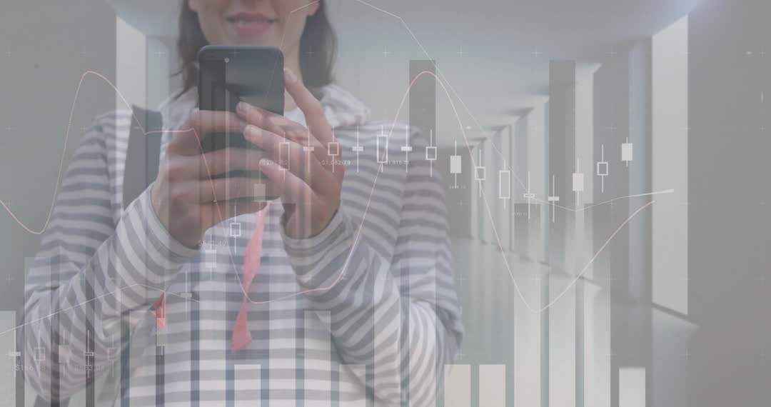 Caucasian woman interacts with smartphone while financial graphs and charts overlay screen. Great for illustrating technology's role in finance and personal investments. Ideal for articles on economic trends, mobile trading, and digital finance tools.