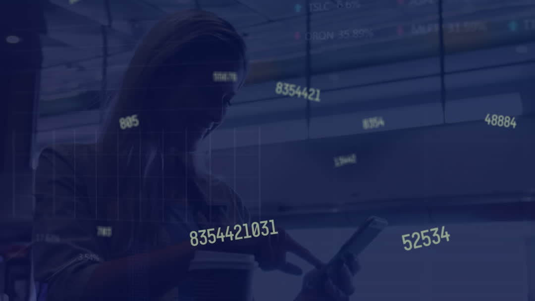 Caucasian Woman Engaged with Financial Data Overlay Society Video