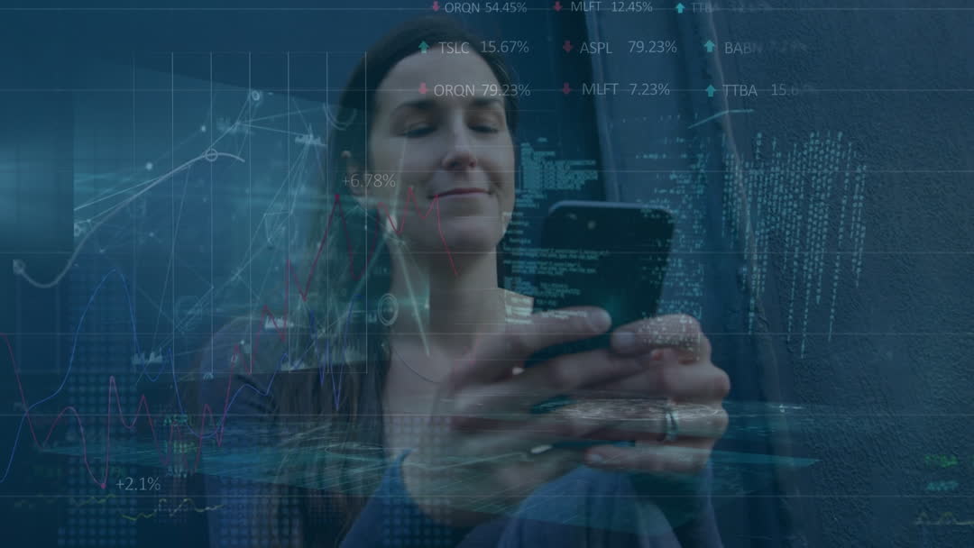 Caucasian Woman Engaging with Smartphone and Stock Market Data Overlay Video