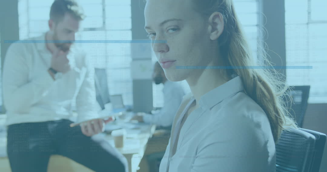- Caucasian Woman in Office with Data Processing Animation Overlay