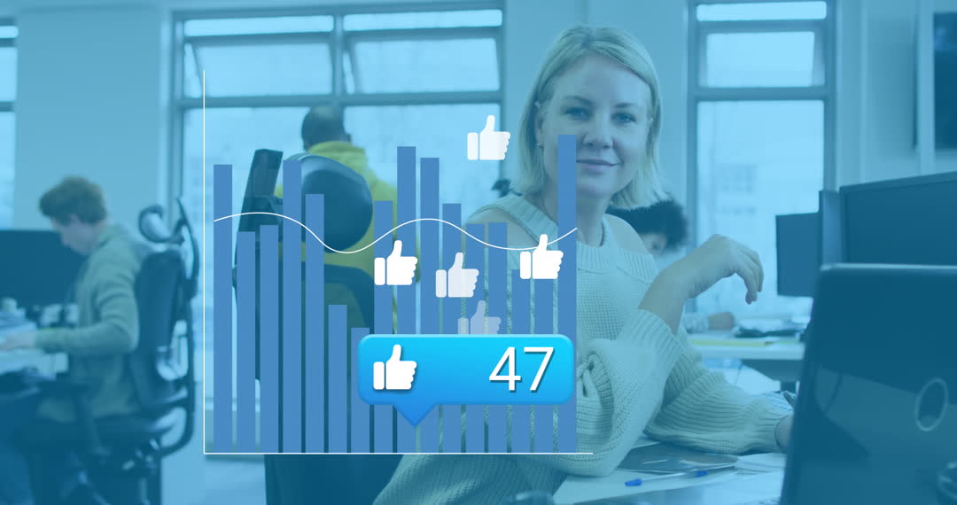 - Caucasian Woman in Office with Social Media Reaction Graphs