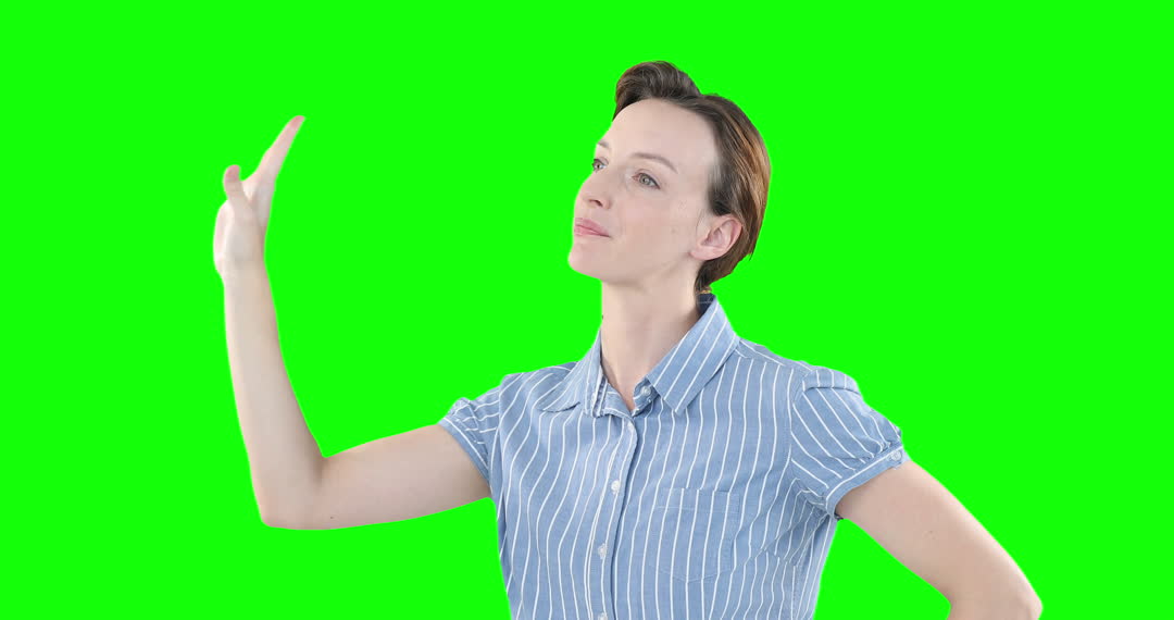 Caucasian Woman Interacting with Virtual Interface on Green Background Video